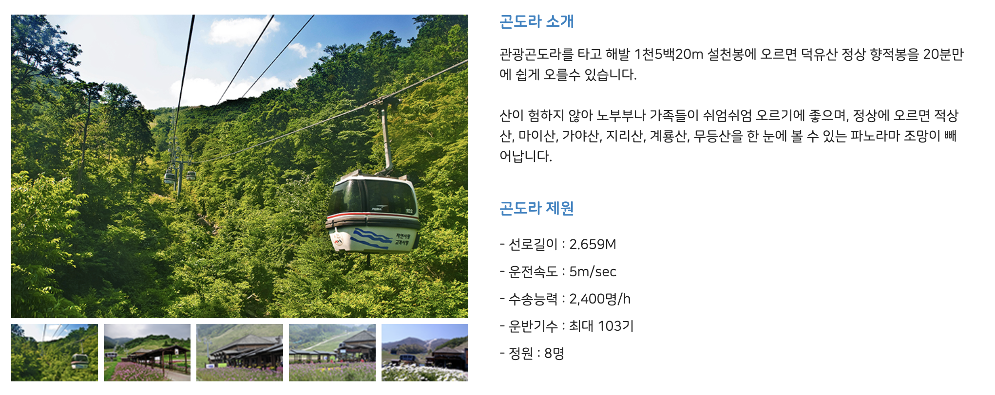 관광 곤도라를 타고 해발 1천 5백 20m 설천봉에 오르면 덕유산 정상 향적봉을 20분만에 쉽게 오를 수 있습니다.