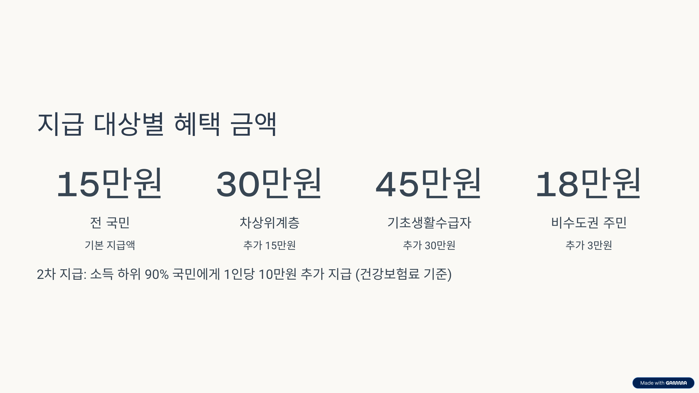 - 소득 하위 90% 국민: 1인당 10만원 추가 지급 (건강보험료 기준)