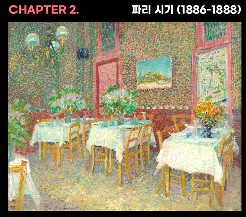 • 파리 시기 (1886-1888): 인상주의의 영향을 받아 밝고 다채로운 색채와 점묘법 등 새로운 시도가 돋보이는 시기입니다. 〈자화상〉, 〈꽃이 있는 정물화〉 등이 대표작입니다.