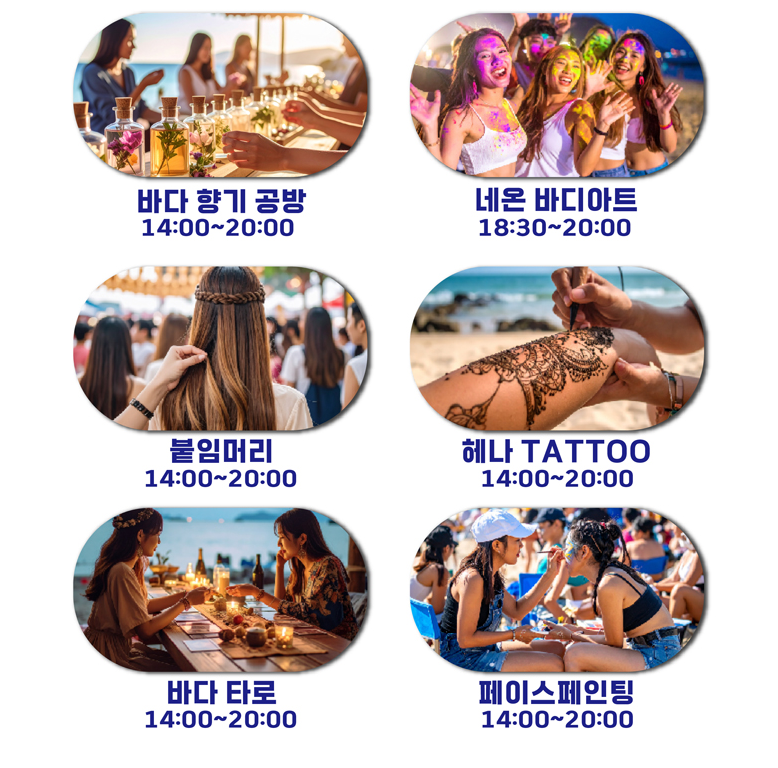 - 내용: 부산 최대 규모의 해변 야시장이 운영됩니다. 올해는 동측 해변까지 구역을 확장하여 더욱 다양한 푸드트럭과 지역 특색 먹거리를 선보일 예정입니다. 미식가라면 절대 놓쳐서는 안 될 프로그램입니다.