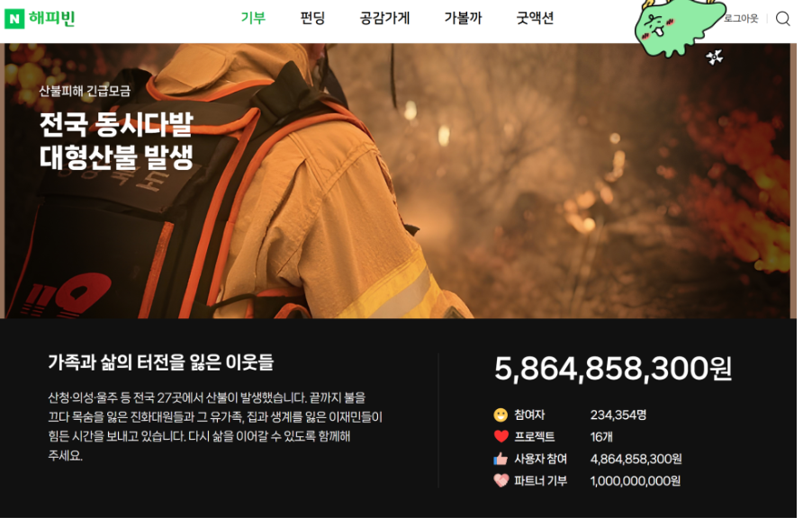 네이버의 해피빈 플랫폼도 산불 피해 기부에 있어 큰 역할을 하고 있습니다. 전국재해구호협회, 사회복지공동모금회, 대한적십자사 등과 협력해 모금을 진행했으며, 네이버 역시 회사 차원에서 10억 원을 기부하며 힘을 보탰습니다.