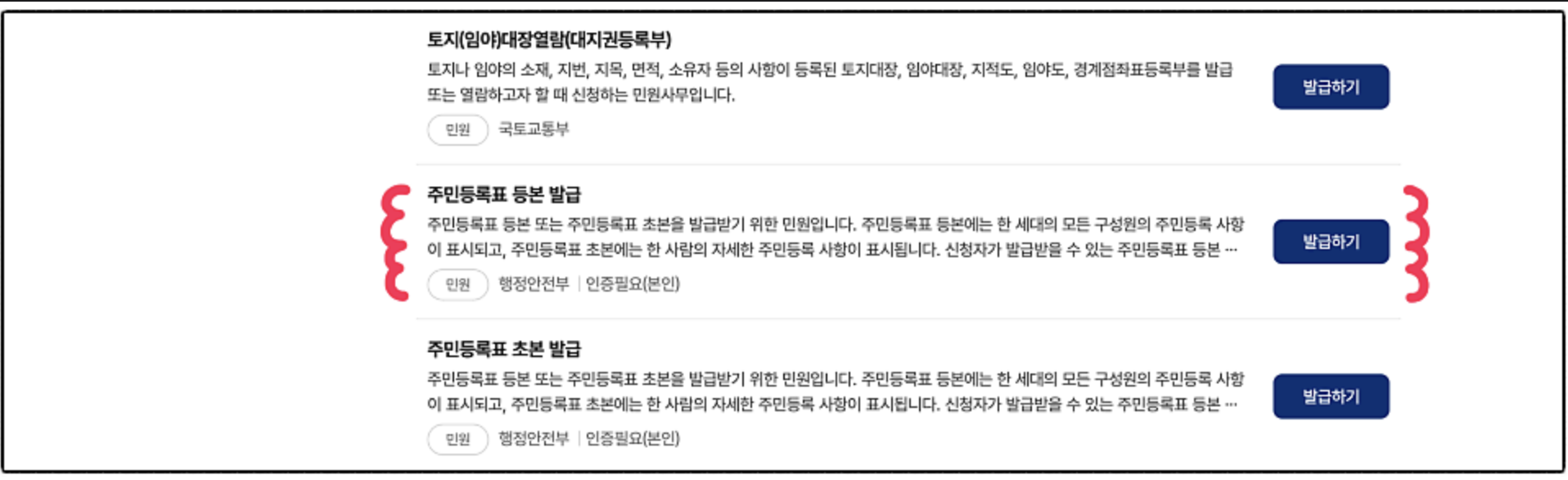 5. '주민등록등본표 등본 발급' 발급하기를 눌러줍니다.