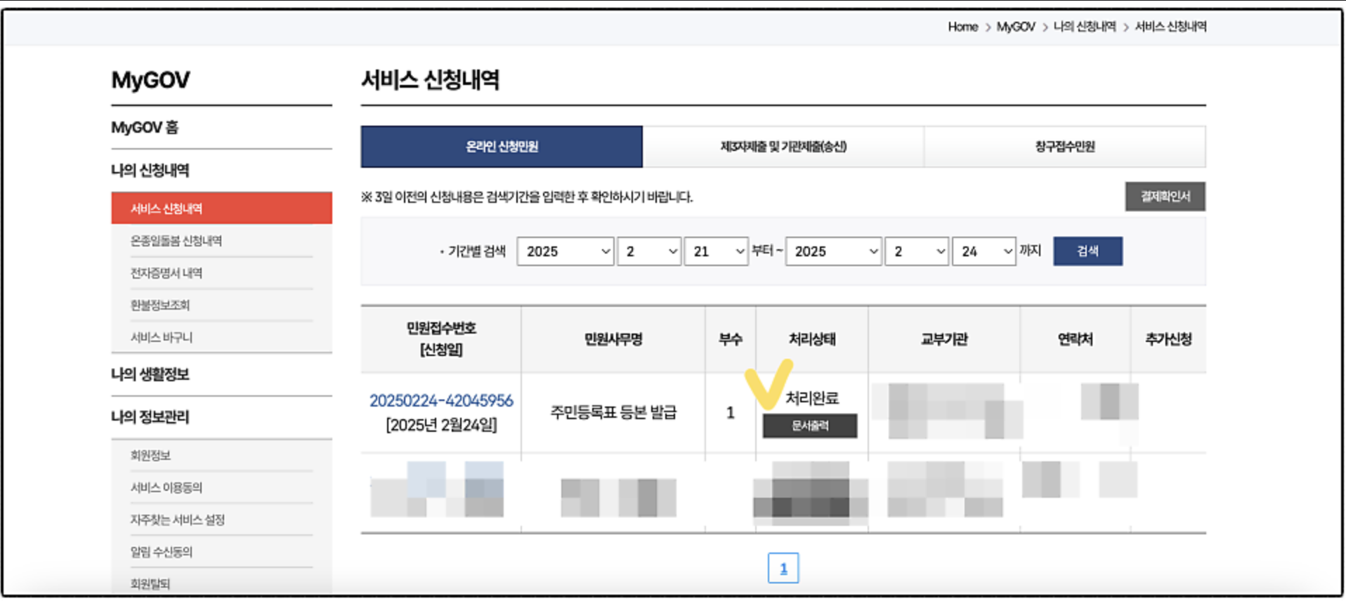 7. 신청하기를 누르면 서비스 신청내역으로 바로 이동하면 문서출력을 눌러줍니다.