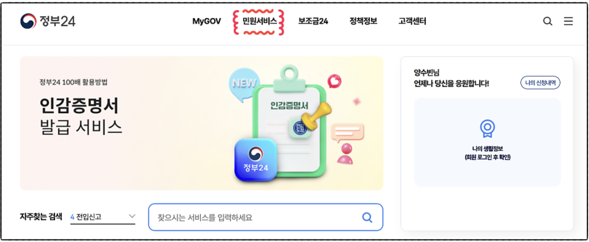 1. 포털사이트에 정부24를 검색해서 접속하시거나 아래 링크를 통해 바로 접속 가능합니다.