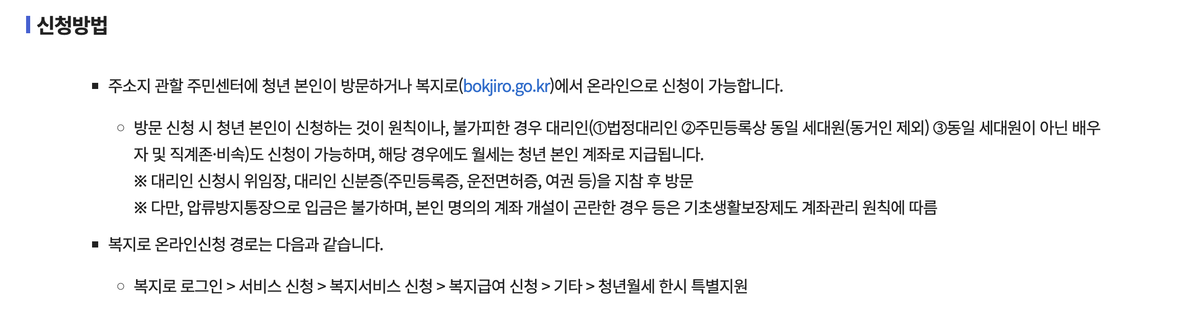 • 복지로 로그인 > 서비스 신청 > 복지서비스 신청 > 복지급여 신청 > 기타 > 청년월세 한시 특별지원