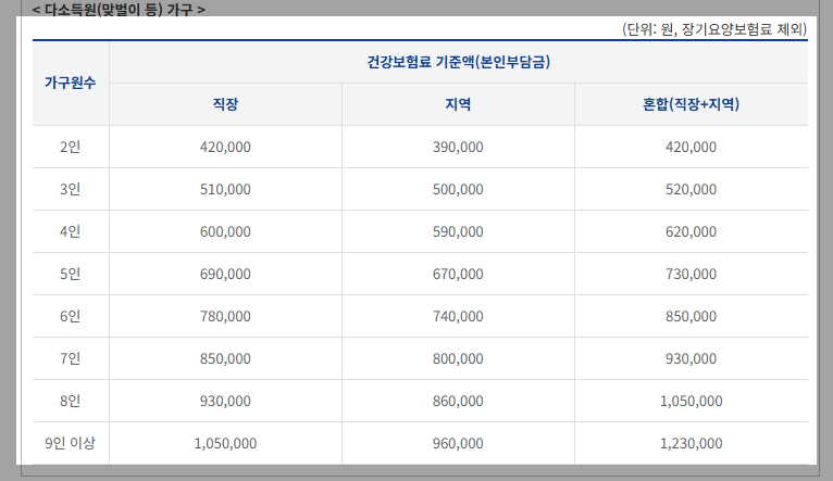 다소득원 가구 건강보험료 기준 (장기요양보험료 제외, 단위: 원)
