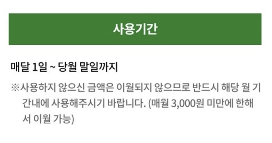 매월 1일 바우처 카드에 지원 금액이 착! 충전됩니다. 당월 말일까지 사용해야 하지만, 3,000원 미만의 잔액은 이월 가능하다는 사실! 잊지 마세요!